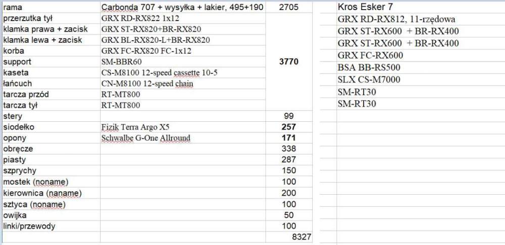 Dla potomnych zaktualizowałem na szybko ceny i komponenty ww. zestawu na lepsze i nowocześniejsze odpowiedniki z bardziej europejskimi/ludzkimi cenami. Wychodzi 200 zł więcej niż za Krosa po przecenie, a nie wszystko chce mi się sprawdzać i szukać okazji. Ceny z dziś z bike-discount.de, można kupić jeszcze taniej, wystarczy poszukać. Obok cen jest dla porównania Esker i jego komponenty. Zmieniając grupę z 820 na 610 jest do urwania kolejne 200 eur / 850 zł