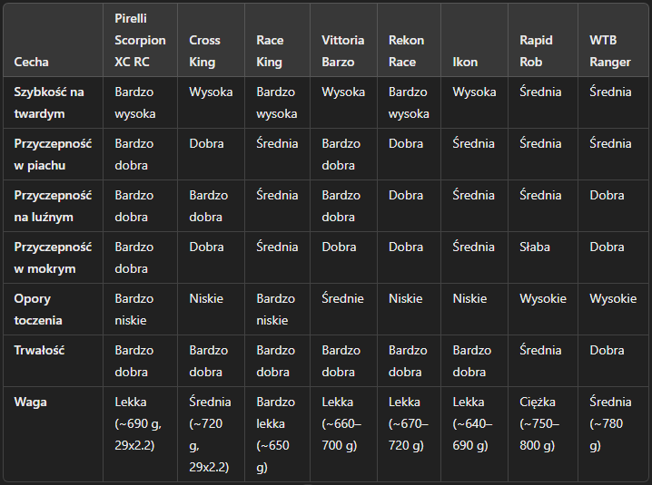 1938 Napisano 4 Stycznia Autor Napisano 4 Stycznia (edytowane) Czy po zakupie fulla jest sens dalej trzymać hardtaila na płaskie i mniej techniczne maratony? Muszę kupić nowe opony do 2 rowerów, bo bieżnik mocno zużyty i mam dylemat: 1. Vertex 990. Obecnie są włożone opony Maxxis Ikon 2.20". Są szybkie zarówno na asfalcie i w terenie. Jechałem nim maraton po ściółce, szutrach i piachu. Przyczepność na piachu i sypkich kamyczkach jest średnia. Piaszczysty odcinek pod górkę muszę podejść. Ale co stracę na piachu, to odrobię na pozostałych odcinkach. Zastanawiam się, czy kupić nowe Maxxis Ikon, czy zmienić na inne. Race Kingi pewnie jeszcze przyspieszą ten rower. Znalazłem jeszcze Pirelli Scorpion XC RC. Które mają lepszą przyczepność (głównie na piachu i szutrze)? 2. Scale 930. Obecnie są włożone WTB Ranger 2.25". Jestem średnio zadowolony. Są toporne i wg mnie średnio przyczepne. Zależy mi na przyczepności w złych warunkach: błoto, śliska ściółka, trawa, ale także na sypkich nawierzchniach. I żeby były szybsze niż WTB. Prawdopodobnie zdecyduję się na 2x Vittoria Barzo lub Barzo/Mezcal. Która opcja lepsza? Dodatkowo koła zmienię na XR1700 i chyba nic więcej, bo się nie opłaca. Zależy mi na opiniach, jak te opony wg was sprawują się w różnych warunkach: Continental Cross King Continental Race King Maxxis Ikon Maxxis Rekon Race Pirelli Scorpion XC RC Schwalbe Rapid Rob Schwalbe Racing Ray / Racing Ralph Vittoria Barzo Vittoria Barzo (przód) + Vittoria Mezcal (tył) WTB Ranger Rower nr 1 będzie wykorzystywany raczej w suchym i po piachu, rower nr 2 zależy od pogody (głównie w trudniejszych warunkach). Oba po sezonie idą na sprzedaż. ChatGPT stworzył takie porównanie: Edytowane 4 Stycznia przez 1938 Cytuj