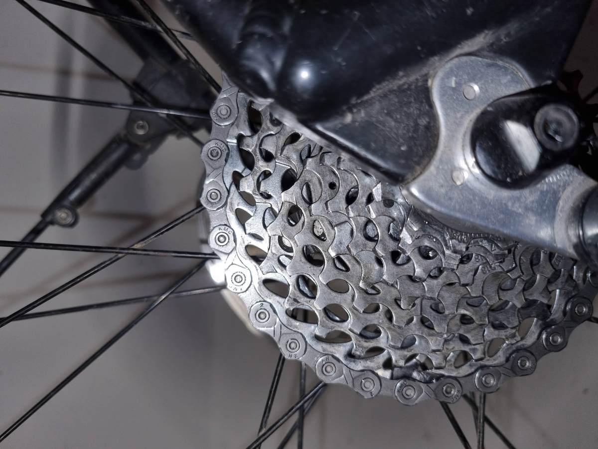 miki11 Napisano 27 Czerwca 2023 Napisano 27 Czerwca 2023 (edytowane) Shimano SG-X: duży blat S44 średniak M9 8-32 mały M9 S22/HG X-22 Prawdopodobnie wykrzywiony jest też hak przerzutki (Shimano RD-M410), być może też sama przerzutka ucierpiała podczas solidnej gleby. Namierzam problem z przeskakiwaniem nowego łańcucha KMC S9 (oryginalnie był Shimano HG-53). Z tyłu prawie nowa kaseta HG-X (chyba, z pamięci piszę). Czy haki są uniwersalne, czy trzeba szukać np. do danej ramy? Proszę o ocenę zużycia na podstawie zdjęć. Co można ew. włożyć zamiast przerzutki RD-M410, żeby było ekonomicznie i dobrze? Ostatnie zdjęcie pokazuje lekkie wykrzywienie haka przerzutki, nie wiem, czy to jest uszkodzenie, czy tak ma być. Edytowane 27 Czerwca 2023 przez miki11 Uzupełniłem opis Cytuj