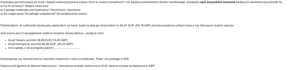 spidelli Napisano 8 Lutego 2025 Napisano 8 Lutego 2025 (edytowane) Kupowałem oryginalną stopkę: Sklep naliczył mi jakiś podatek, DHL obsługiwał przesyłkę, w tym odprawę celną, przysłali mi oświadczenie do wypełnienia - cena towaru, koszt wysyłki, materiał, do czego to służy Nie bardzo wiedziałem, jak to wypełnić. bo sklep rozliczył mnie w EUR a kwity były w GBP, ostatecznie załączyłem powyższego print-screena + print-screen z konta (ile zapłaciłem) i poszło. W zasadzie chyba tylko VAT płaciłem, cło jest chyba od wyższej wartości, więc przy ramie możesz się załapać. Mnie VAT i cło kopnęło przy zakupie w USA, pamiętam że robiłem jakąś dopłatę. Też chciałem, żeby mi znajomy przywiózł ale marudził, że go z taką lagą wezmą do rewizji na lotnisku; potem myślałem, że może mi kupi i wyśle prywatnie, wtedy i VAT/cło mnie ominie i koszt wysyłki będzie niższy, bo w tym sklepie był tylko expres, jak widzisz droższy od samego zakupu a mnie na czasie nie zależało. No ale ostatecznie jako to w życiu - jak sam nie zrobisz, to nie będzie Gdybam, że jakby ktoś to przywiózł autem, nawet nówkę w kartonie, to uniknąłby opłat, bo opłaty są od sprzedaży a to przecież dla siebie wiezie Formalnie cło jest od równowartości 150 EUR i więcej, o ile towar nie został wyprodukowany w UK: 1ec33ed0-9f2f-4d13-8c36-4308e39fd597_pl Polak potrafi: Paczki do Anglii i paczki do Polski po Brexicie 2024 Edytowane 8 Lutego 2025 przez spidelli Cytuj