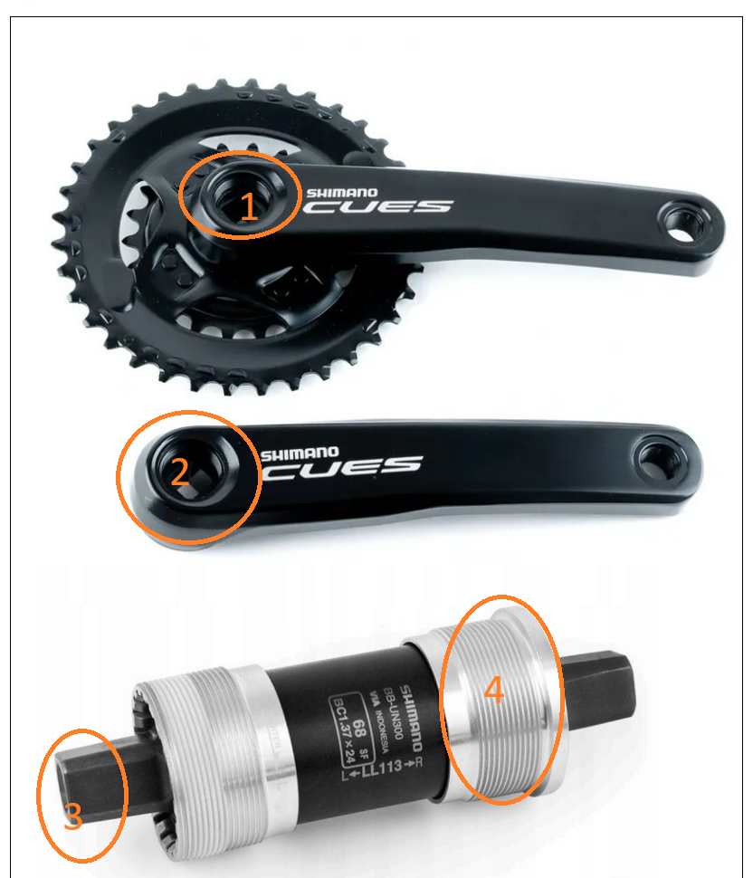 StrayRider Napisano 18 godzin temu Napisano 18 godzin temu Cytat Koniec końców ściągnąłem korbę ściągaczem do łożysk, ale w osi (rura przelotowa) jest gwint, czy są jakieś inne typy ściągaczy do takiej korby , żeby wykorzystać ten gwint w osi? Jeżeli chodzi Ci o to jak zdemontować korbę z wykorzystaniem gwintu (nr 1 - rysunek poniżej), to ... Cytat czy są jakieś inne typy ściągaczy do takiej korby Zasada w ściągacza jest taka sama: 1.Oczyszcić gwint przed wkręceniem ściągacza. 2.Zwiększona uwaga przy wkręcaniu. 3.Użyć ściągacz o "lepszej" jakości, np: Ściągacz do korb PARK TOOL CCP-22 Ściągacz do korb SHIMANO TL-FC10 Ściągacz do korb Topeak Universal Crank Puller Dodatkowo należy sprawdzić czy ma się odpowiedni ściągacz do odpowiedniego systemu(typu suportu) czy ściągacz nie uszkodzi gwintu nr 3, tj. rozmiar trzpienia w ściągaczu - w jaki sposób opiera się na osi: (można wkręcić w suport śrubę o innym typie śruby,. lub jeśli suport do wymiany to aż tak nie trzeba uważać ) Cytuj