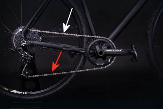 @Q_u normalnie smarujesz tak jak czerwona strzałka. Tutaj od góry mam na myśli to co oznaczyłem na biało. Chodzi o to aby ten bardzo dobrze wyczyszczony łańcuch dostał dużo nowego smaru MOMUM. Pamiętaj, że takie obfite smarowania robisz tylko za 1 razem. Pierwsze smarowanie od góry i od dołu, drugie od dołu i trzecia znowu od góry i od dołu. To przygotowanie za pierwszym razem napędu. Potem smarujesz już normalnie. Oczywiście boków nie smarujesz (jak skapnie to można olać i nie trzeba wycierać).