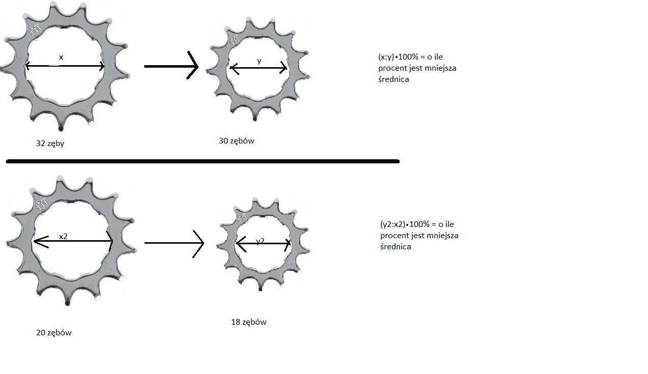 M333 Napisano 6 Stycznia 2011 Napisano 6 Stycznia 2011 Ja mam w tej chwili 22 na najmniejszej koronce wiec będzie większa różnica jak dam o 4 więcej z tyłu niż o 2 mniej z przodu . Ale to ciekawe zagadnienie, czy gdyby, np. dodać z tyłu więcej o 4, albo z przodu mniej o 4 to czy kręciło by się tak samo. W sumie kwestia przełorzenia zależy od średnicy a nie ilości zębów, a przecież średnica zmieni się inaczej, gdy zabierzemy np. 2 zeby z 32 a 2 gdy z 12. "Lekkkość" kręcenia zależy od przełożenia, a to z kolei zależy od pewnego współczynnika, który możemy sobie łatwo obliczyć. Dzielimy liczbę zębów korby przez liczbę zębów największej zębatki w kasecie. I tak np. możemy wyrachować, że przełożenie 22:32 (~0.69) odpowiadać będzie kombinacji ~21:30 czy 26:38. Ameryki nie odkryłem, ale być może moje wyjaśnienie pozwoli zrozumieć niektórym poruszaną kwestię.