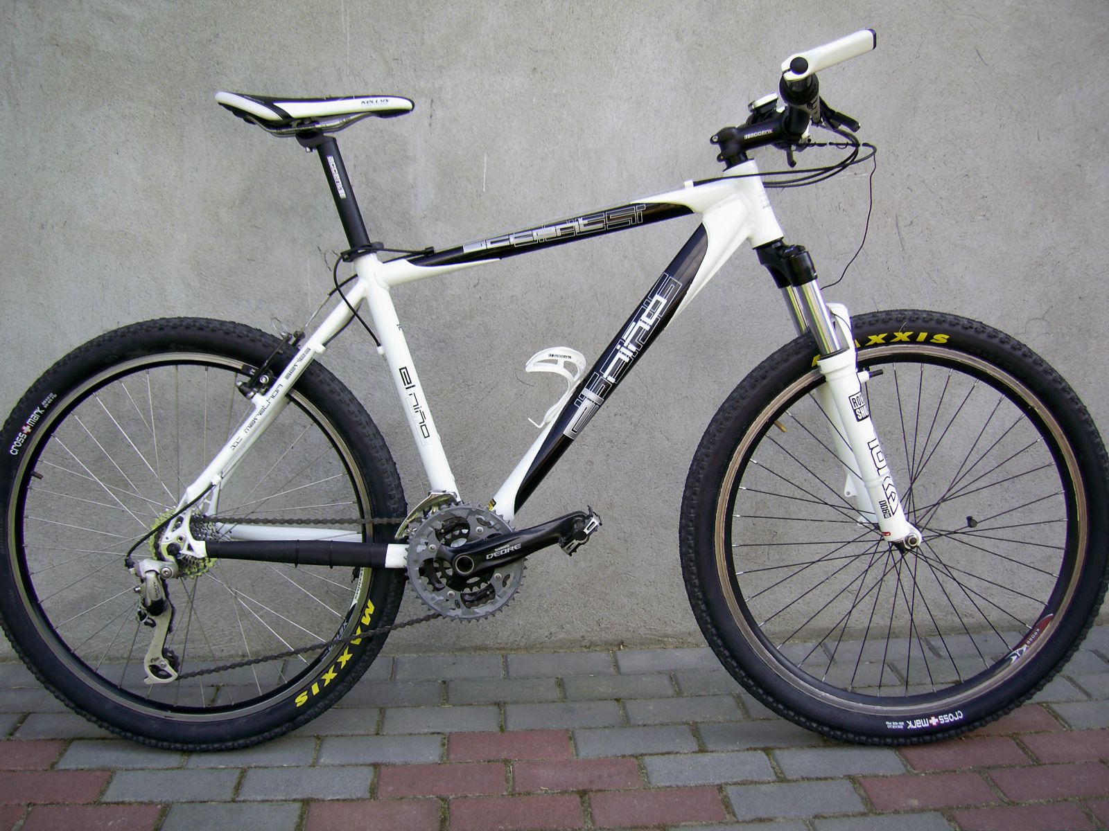 pawel199224 Napisano 17 Lipca 2011 Napisano 17 Lipca 2011 witam. Po miesiącu "ciężkiej" pracy w firmie zajmującej sie przetwórstwem owoców i żebraniu kasy od rodziców udało mi sie wkoncu złożyć nowy rowerek. Wczesniej miałem da bomba xlr 8 ale ze naszło mnie na dalsze wycieczki postanowiłem sprzedać co sie da ze starego bike'a i złożyć coś nowego ala XC. Wybór padł na accenta el nino a oto on: Rama: Accent El Nino 19" biało/czarny Widelec: Rock Shox Tora 318 solo Air Manetki: Sram Plasma 3x8 a raczej to co z nich zostało Przerzutka przednia: Shimano Deore Przerzutka tylna: Shimano Alivio 2008 Korba: Shimano Deore M590 Suport: oryginalne łożyska z M590 Kaseta: Shimano HG50 Łańcuch: Shimano HG50 + spinka Pedaly: Accent Lithum Pancerze: Shimano SIS Hamulce: V-ki Tektro (tylko tył) Klamki: abojawiemcoto? ale są długie i wygodne Stery: Accent (gratis do ramy) Wspornik kierownicy: Accent AS-361 100mm 31.6 Kierownica: Truvativ Riserbar 31.8 Gripy: noname Kapsel: Accent Rogi: Accent Arrow Siodło: Kollys cognithor Sztyca: Accent SP-495 31.2 Zacisk sztycy: Accent X-COUNTRY Koło tył: Piasta: North Shore (nie znam modelu) Felga: Alexrims (nie znam modelu) Szprychy: DT Swiss Opony: Maxxis Crossmark 2.0 drut Dętki: continental Koło przód: koło: od kross'a hexagona Opony: Maxxis Crossmark 2.0 drut Dętki: continental licznik: Kellys Nie wiem jeszcze ile waży ale to nie jest dla mnie priorytet. Jak wykombinuje wage elektroniczną to napisze. Porównywałem go z levelem a4 kolegi sposobem 'na reke' i kross jest sporo cięższy. Prosze nie piszcie nic na temat przedniego koła , hamulców, przerzutki tylnej z którą nie wiem co sie stało - obczajcie na zdjeciach (przeskoczyła na spreżynie chyba), oraz gripów ktore sporo ze mną przeszły w dabombie i są dosłownie zdarte..... no nazwijmy to odchudzaniem, przynajmniej mniej ważą. Wszystko to idzie do zmiany gdy tylko będę miał kase. Pierwsze koło, potem hamulce na juicy 3 a nastepnie manetki z przerzutką tył na sram x7. Chyba ze doradzicie coś innego koszt roweru wyniosł mnie około 1700zł. Wydaje mi sie ze za tą cene nie kupiłbym gotowca z tej klasy amortyzatorem , taką ramą i osprzetem. zdjęcia: reszta fotek tutaj: http://www.forumrowerowe.org/gallery/album/1483-moj-el-nino/ Obczajcie tą przezutke. Moze wiecei dlaczego ma takie dziwne ułożenie. I ciężko ją wyregulowac.